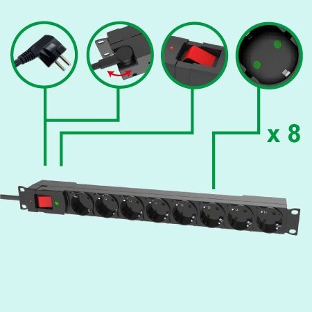 德式8孔機架式電源分配器是給 19 英寸機架機櫃在安裝多個設備供電之排插插座且兩側有一體成型固定支架孔及產品背面的鎖孔安裝槽可增加安裝便利性。外殼選用耐衝擊的塑料製,具備安全防觸電保護門,防雷突波保護功能外並可選配內置的EMI / RFI雜訊濾波器,為了可靈活放置在機房, 機櫃或 電器家具架設備內特別使用90度旋轉電源線夾設計讓設備空間更加乾淨整齊。