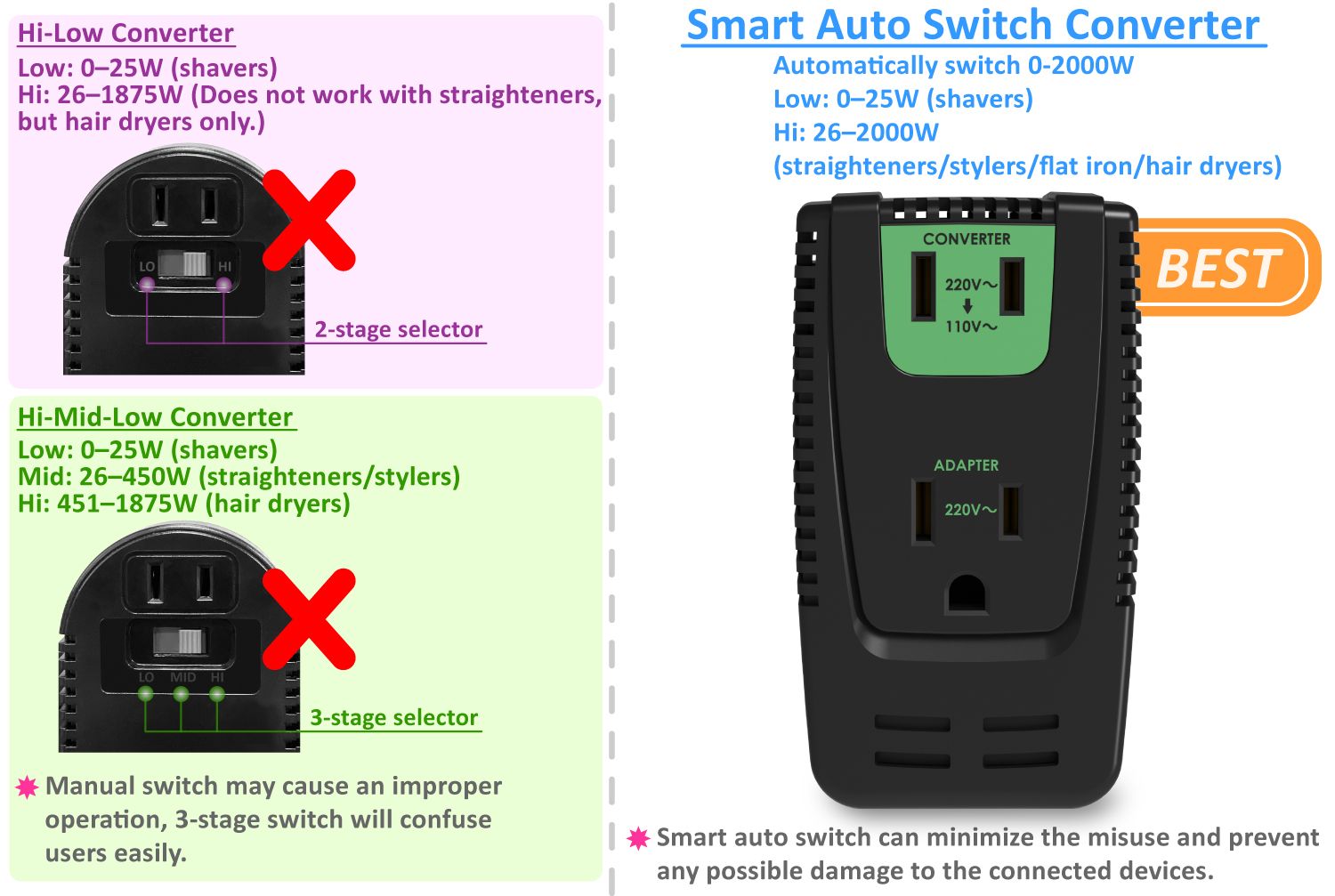 創新的25/2000W專利自動切換旅行變壓轉換器,是專為220/240V市電轉換為100/120V使用的電源變壓轉換器,以適用於大多數額定功率高達2000瓦的美國可攜式電器。AI智能雙瓦雙插座旅行變壓器可依不同連接設備的額定值,自動偵測並切換高低功率0-25W和26-2000W以適用不同的電器裝置。內建專利的電路設計可自動判別並調整至合適的功率設定,不再需要功率切換開關,26-2000W高功率檔位適用於高端手持式造型設備(例如捲髮器、吹風機或直髮器)以及基本造型設備。