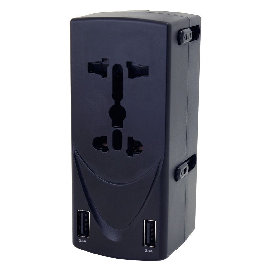 此款雙插座萬國旅行轉換器同時包含兩個USB充電輸出接口,可以同時為兩個設備充電。 兩個USB輸出接口總輸出電流為2.4A, 單USB充電接口輸出最大為2.4A,適用於各種智慧型手機ˋ平板電腦ˋ數位相機等數位設備充電。